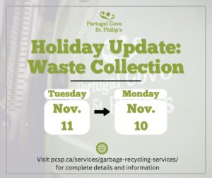 The Town of Portugal Cove-St. Philip’s would like to remind residents of two changes to the waste collection schedule: