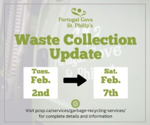 Waste collection originally scheduled for Tuesday, February 3, 2026 was postponed to Saturday, February 7, 2026 due to weather conditions. This change affects residents who normally have Tuesday-only collection, all other waste collection remains unchanged. Please ensure all items for collection are placed outside by 8:30 a.m. tomorrow, Saturday, February 7.Residents are encouraged to monitor the Community News section on the homepage of pcsp.ca, as well as the Town’s social media channels for the latest updates.
